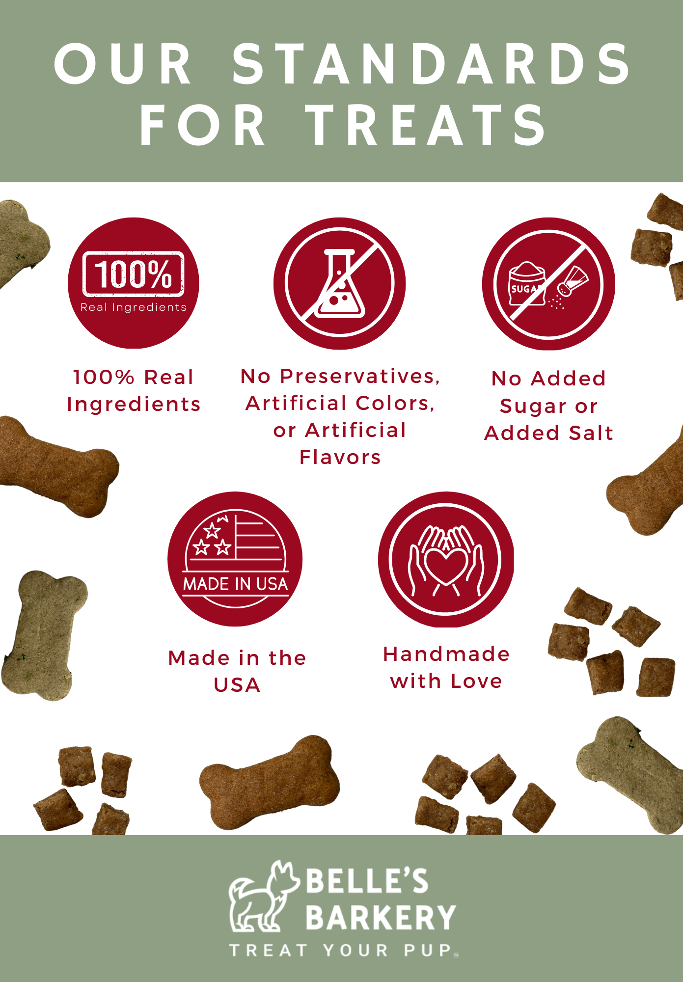 Flip through the images to view the colors that we can create. The shade of color may vary slightly, but that is one of the ways in which each Belle's Barkery treat is custom and unique!